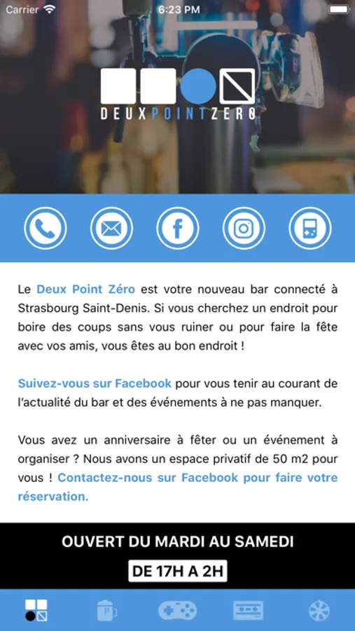- Les infos pratiques du bar (accès, horaires, réservations)