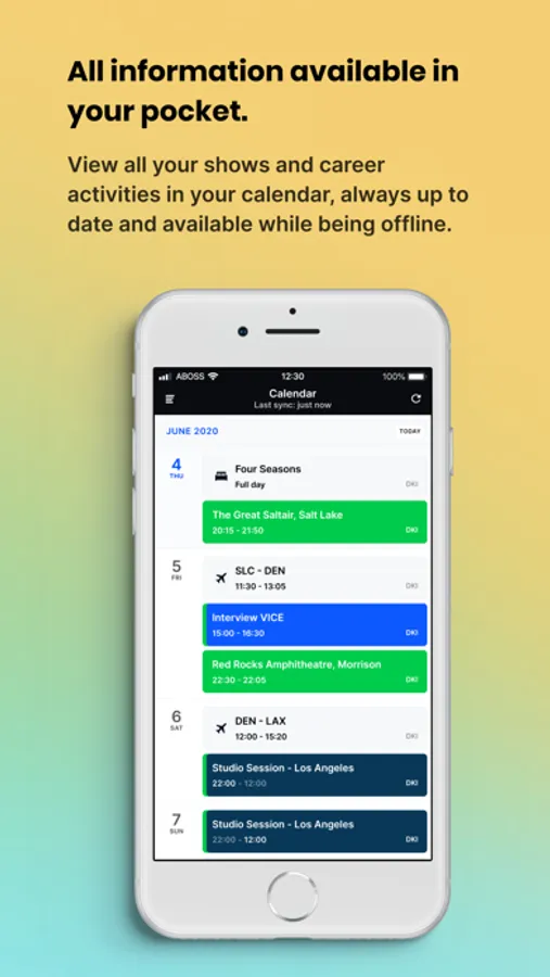 For live shows (ABOSS Agency & ABOSS Artist): all relevant information regarding live shows such as time schedule, contact information, show related files, flights, hotel, ground transportation, deal information and tickets sales. All on a need to know basis.