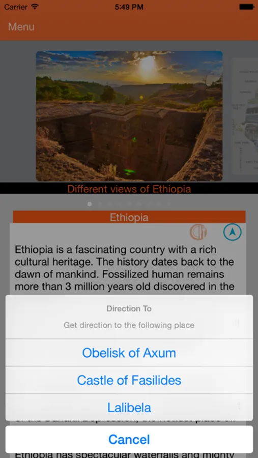 Tour Ethiopia app turns your mobile device into a personal tour guide. The GPS will give you direction to you desire location from your current location. The traveler tip will inform you about Ethiopia climate, time and calendar, health medical facilities and safety, visa and more.