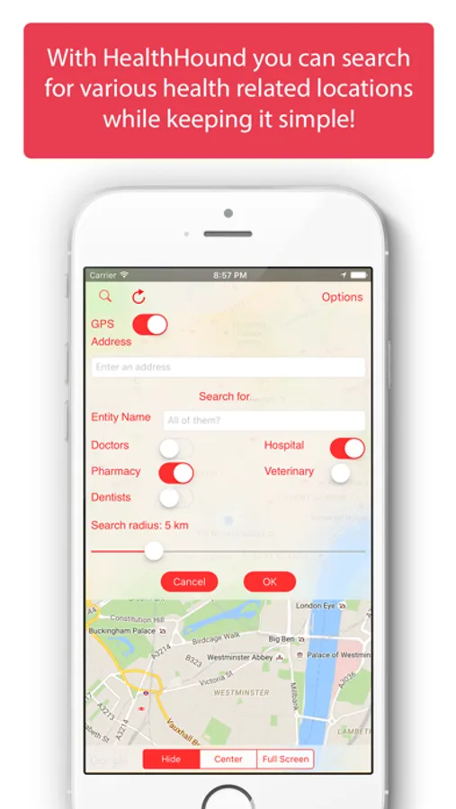 HealthHound is a user friendly tool that will locate nearby doctors, pharmacy, veterinary, dentists and hospital services. Doesn't it bother you whenever you're either traveling, looking for the nearest pharmacy, or where to find the nearest health service? Or even worst, in the middle of the night not being able to find an open pharmacy in order to buy your medicine? That's not all, you can find all sorts of medical services near your location or a given address, just let this friendly dog show you where to go!! Of course, not just show you, but guide you!