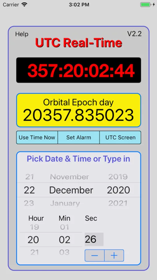 UTC Orbit; is a time conversion utility for use with Earth orbital elements calculations for spacecraft. The application also contains a UTC alarm clock that is based on "Day of Year". UTC stands for "Universal Time Coordinated", but is also known as Zulu Time or GMT Time. The application allows the user to select any epoch time in the future or past via pick wheels and that time is then displayed as YYDDD.FFFFFF where YY=Two digit year, where DDD=day of the year (000 - 366), and where .FFFFFF is the decimal fraction of the day. This is the standard format for manipulation of spacecraft tracking TLE's (Two Line Element sets). The app also works in reverse where the user types in the epoch time and the pick wheels will spin to the human readable date. The alarm is set via the pick wheels and operates in the background for sound and screen notification as well as the foreground if application is running. The user must "allow notifications" for the background to function. A useful feature of the app is that if you rotate the iPhone you then have a large digit UTC clock. iPad large digit clock is selected by touching the button "UTC screen". Note that this locks the screen rotation on all devices and to return to the calculation screen you must touch "Back to main screen".