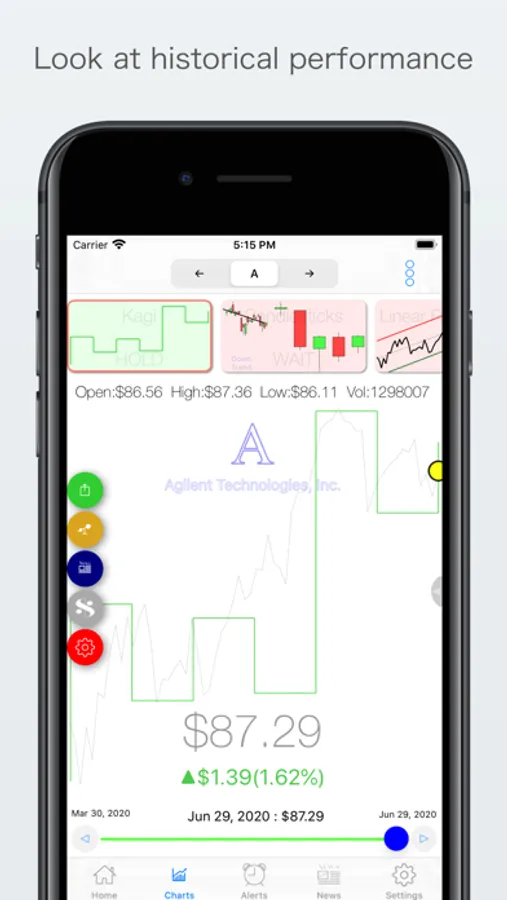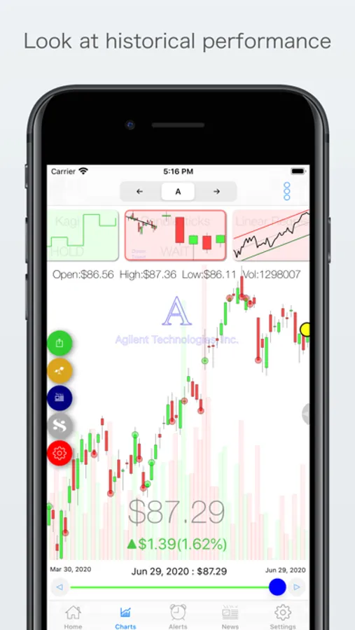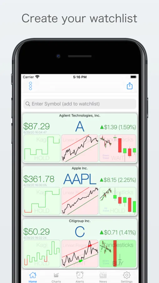 EodTrader monitors user entered watch list and provides the user with technical analysis of stock data for a given stock, specifically, Kagi charts, Candlestick charts, Bollinger, Moving averages and Linear regressions etc. based on end of day data. EOD Trader does automatic analysis of stocks for symbols in the user provided watchlist and can be configured to trade automatically or alert the user when trade related events occur.
