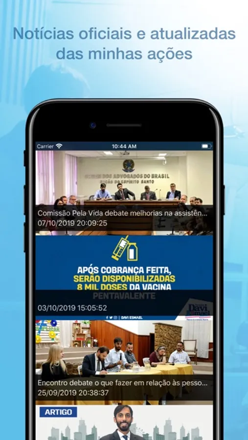Aplicativo do vereador Davi Esmael (PSB), de Vitória/ES. Este é mais um canal direto de comunicação com nosso mandato, em que você pode acompanhar as atividades que temos desenvolvido e colaborar com sugestões de melhorias para a cidade.