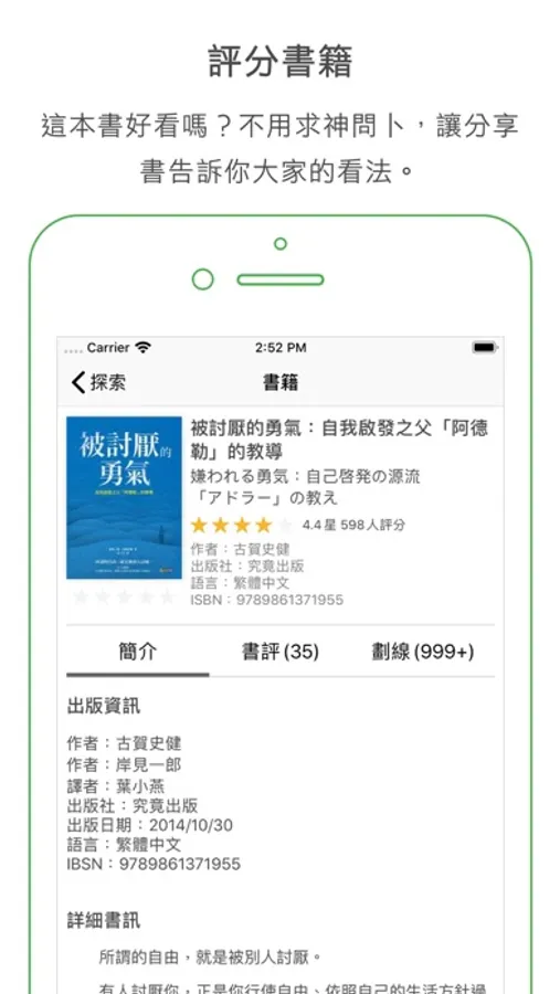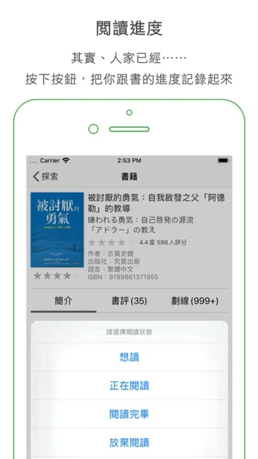 • 閱讀進度:總是有些書買了還沒讀,或是想不起來讀過了沒?用分享書管理你的閱讀進度。