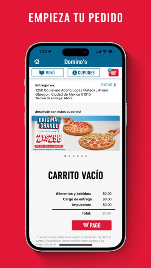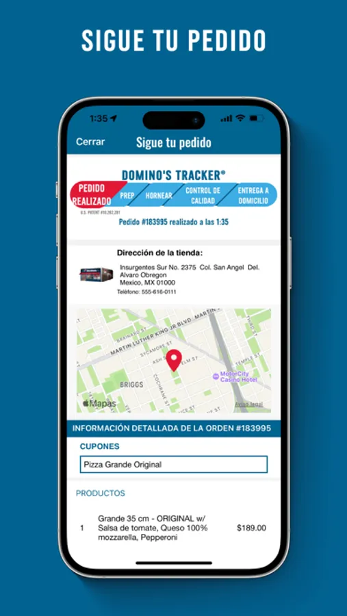 Con la app de Domino's obtén diferentes beneficios y descuentos únicos para compras en línea. Al ordenar en línea, podrás seguir el proceso de preparación de tu pizza con nuestro Pizza Tracker. También, podrás guardar tus pedidos favoritos para ordenar en el futuro con sólo unos clicks.