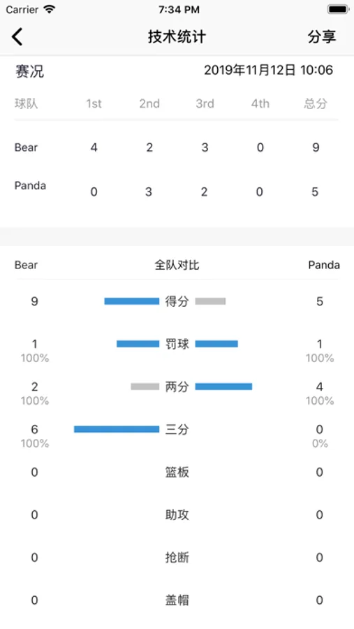 专业的技术统计功能,支持球队、队员两级统计,罚球、两分、三分、篮板、助攻、抢断、失误、犯规,统统覆盖!