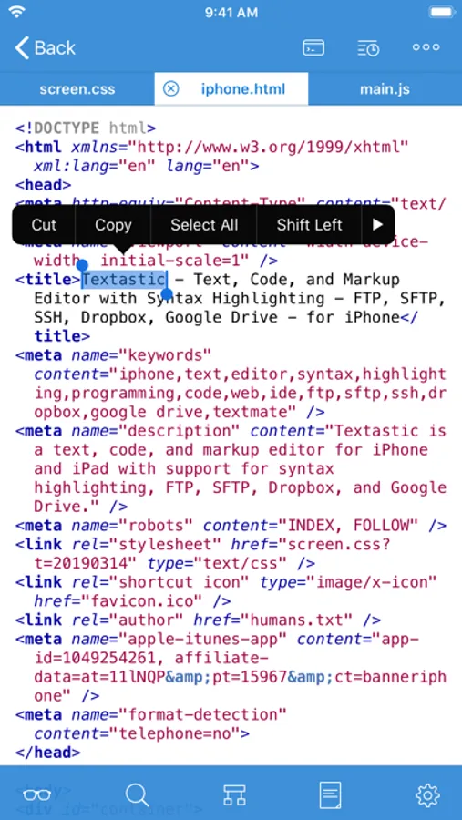 Textastic is the most comprehensive and versatile text and code editor available for iPad and iPhone. It supports syntax highlighting of more than 80 programming and markup languages. Connect to SFTP, FTP, and WebDAV servers or to your Dropbox or Google Drive account. Use the built-in SSH terminal to work directly on your server.