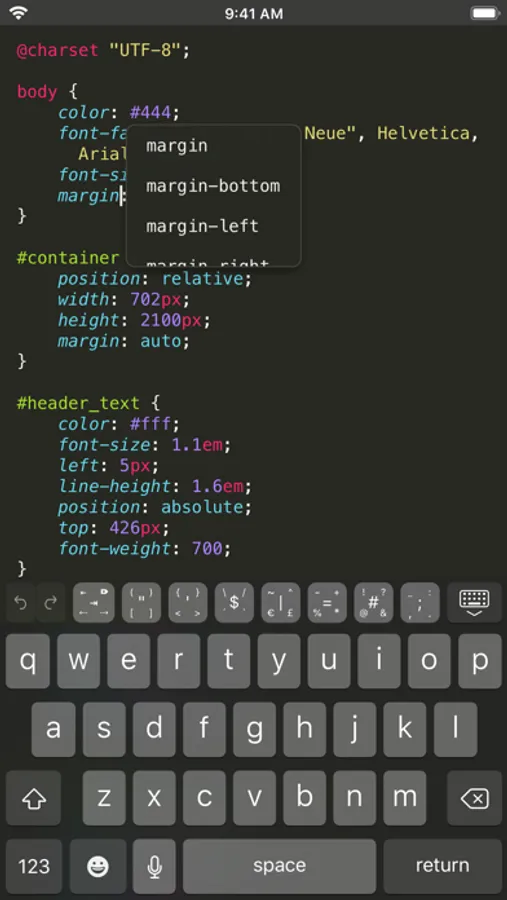 • Code completion for HTML, CSS, JavaScript, C, Objective-C, and PHP