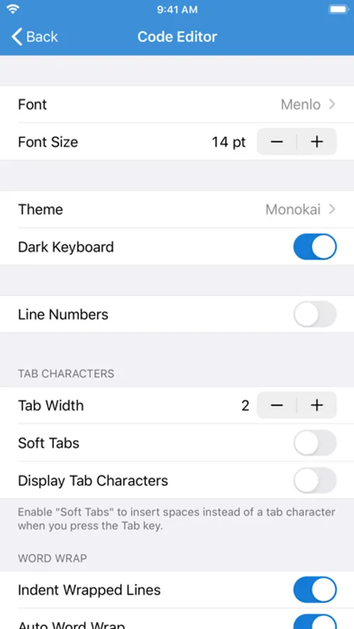 • Supports different tab widths and soft tabs (spaces instead of tabs)