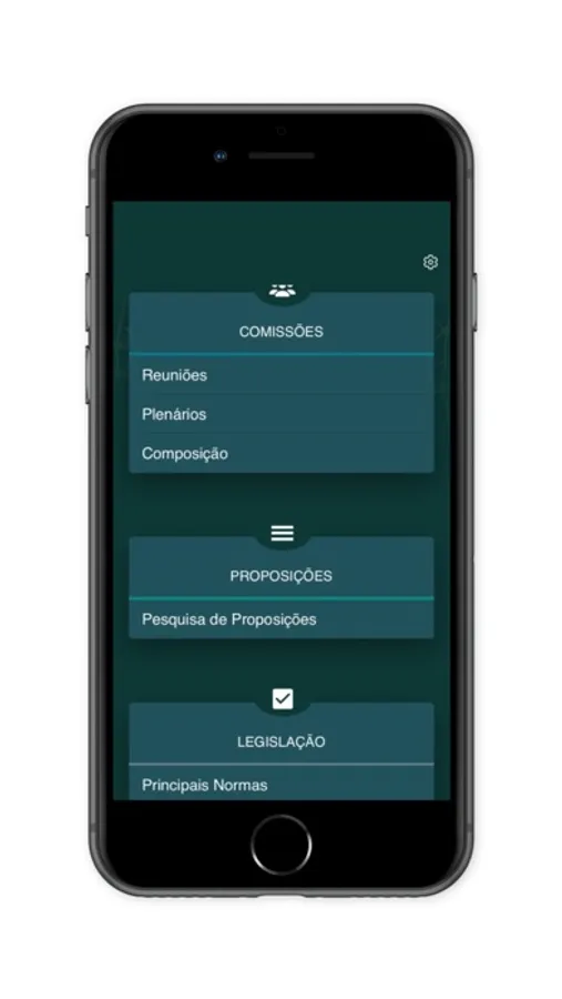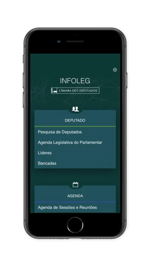 Aplicativo com informações das atividades legislativas da Câmara dos Deputados, com informações sobre deputados, projetos de lei e outras proposições, sessões no plenário, reuniões nas comissões e legislação. Seu conteúdo está disposto em um menu com os seguintes temas e opções: