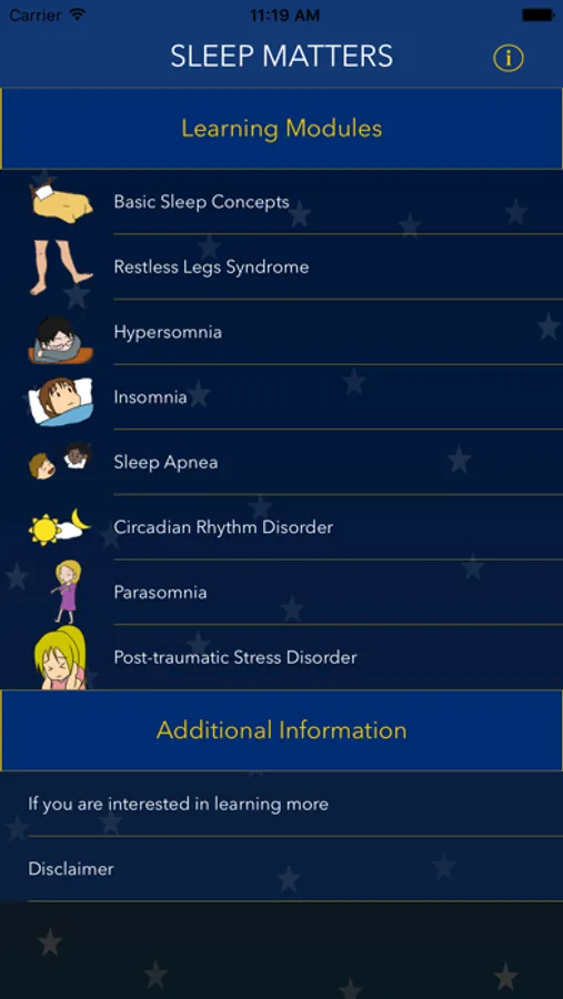 SleepMatters is an engaging and animated educational experience that was composed by an interdisciplinary team of sleep experts at The Johns Hopkins University School of Medicine.The key concepts related to basic sleep physiology and common sleep disorders are presented by Johns Hopkins Sleep experts in brief and high yield mini module formats in a patient friendly format that utilizes engaging and thought provoking techniques to effectively deliver valuable information on sleep. This app allows an individual diagnosed with a sleep disorder or concerned about their sleep health to gain a better understanding of common sleep issues, disorders and healthy sleep behaviors. This app can also serve as a useful resource for health care providers to provide valuable sleep health educational information to their patients.