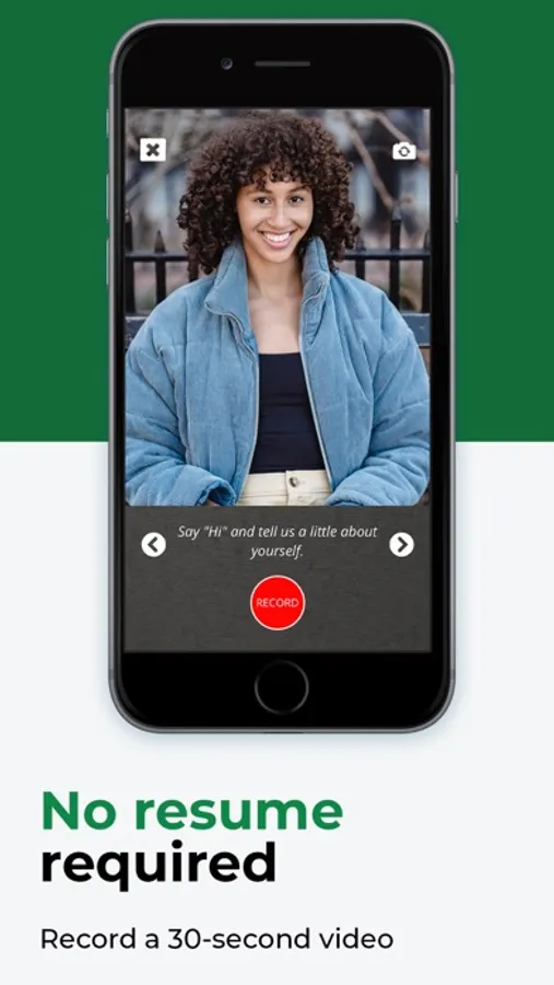 No resume required! Take a 30 second video introduction of yourself to let employers know more about you. You’re 3x more likely to get hired from showing your personality and work experience by uploading a video.
