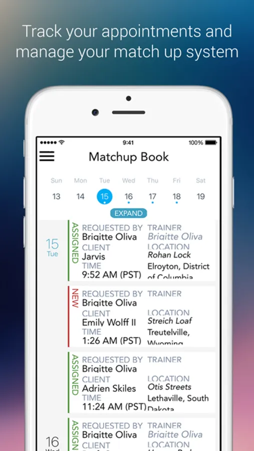 • Request and manage your match up appointments. Assign trainers, accept a matchup as a trainer, view your appointment calendar.