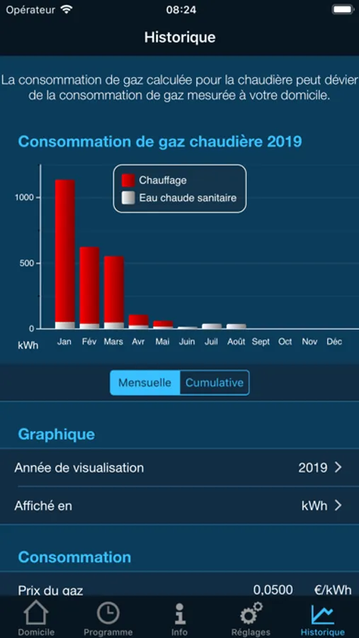 • La représentation graphique de la consommation de gaz de la chaudière permet d’identifier facilement les opportunités d’économies.