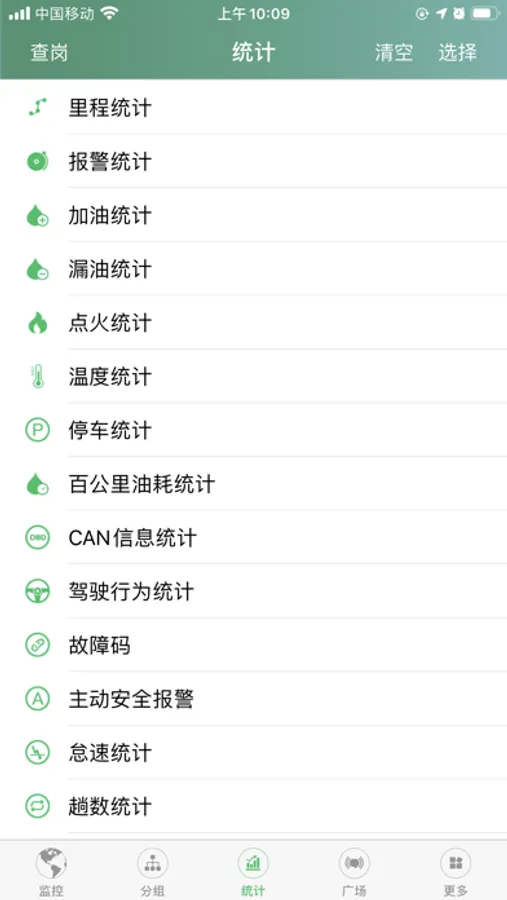 统计(里程、报警、加油、漏油、百公里油耗、温度)