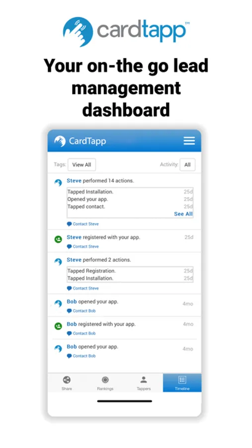 • On-the-go Lead Dashboard: Cardtapp acts as your on-the-go lead hub, keeping you informed about your business's status while you're navigating your day. Stay tuned to every new contact who downloads your digital business card, ensuring you're consistently linked with prospective leads.