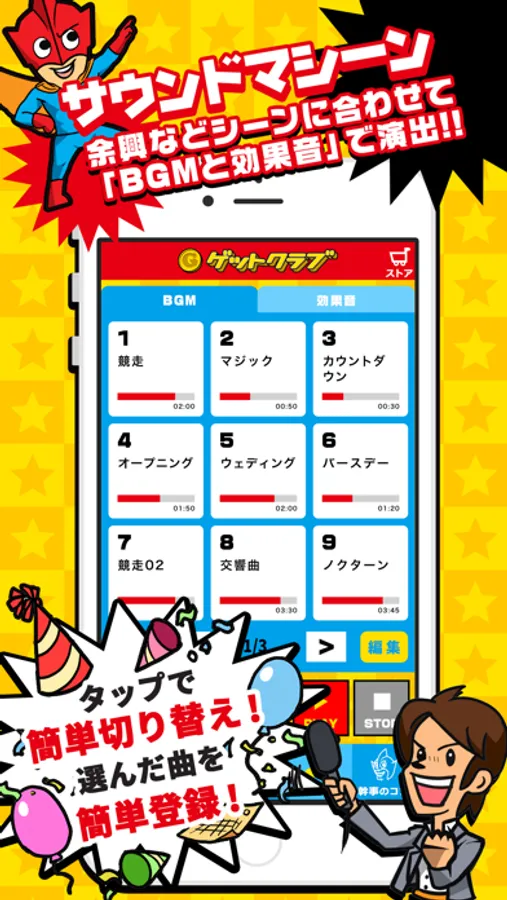 会場の雰囲気演出として、お持ちの音楽をBGMとして流したり、10種類のゲームや余興にぴったりの効果音で会場を盛り上げます。