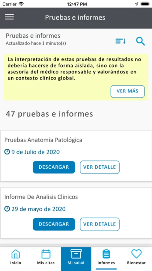 o Consultar los resultados de sus pruebas sin necesidad de tener que desplazarse a su centro médico a por ellos. Podrá descargar y consultar los informes directamente desde su móvil.