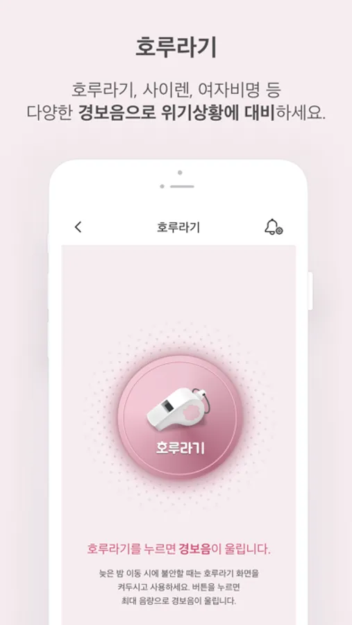 위험 상황에서는 호루라기 경보음 울리기 (호루라기/여자비명/사이렌 소리 설정가능)