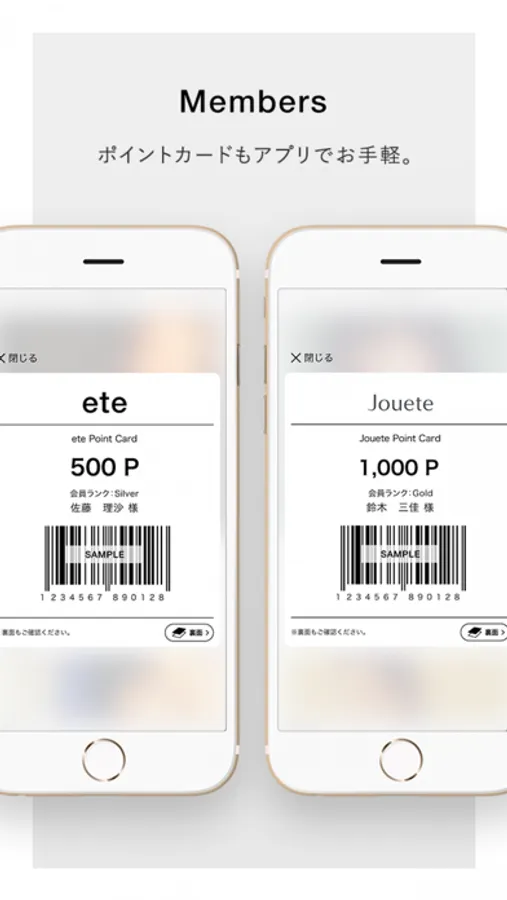 それぞれのブランドの会員バーコードをご提示いただくと、会員ステージに応じてポイントがたまります。