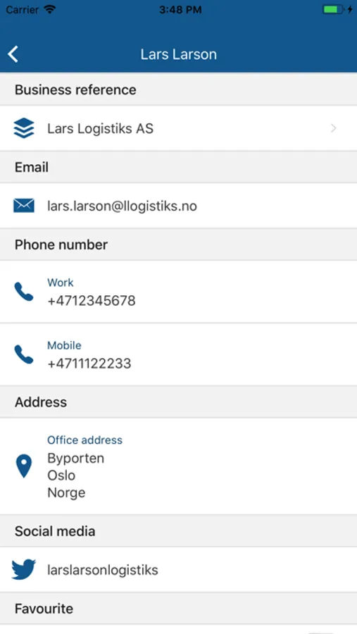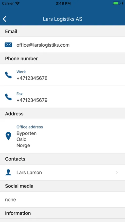 Gain access to customers, suppliers and your contacts directly from your mobile phone. With this app you can easily find contact information such as telephone numbers and addresses and with a simple tap you can call, send SMS or e-mail. You can also bookmark favorites to get faster access and look them up in social media or find the addresses on Google maps.