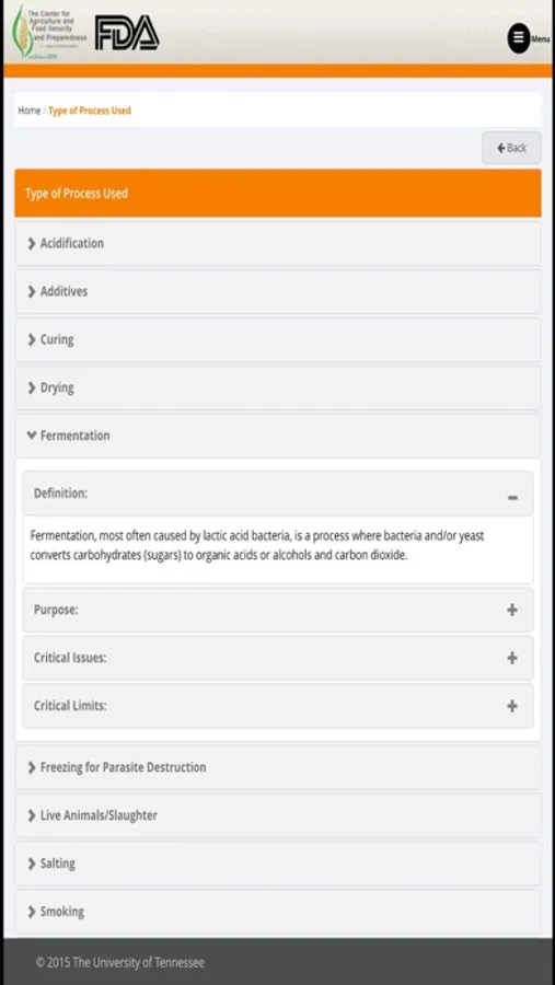 The information is intended as useful information to assist with inspections. It should not replace the interview/risk-based inspection. Foods can vary greatly from establishment to establishment and may not follow the definition/guidance/critical measures provided in this app.