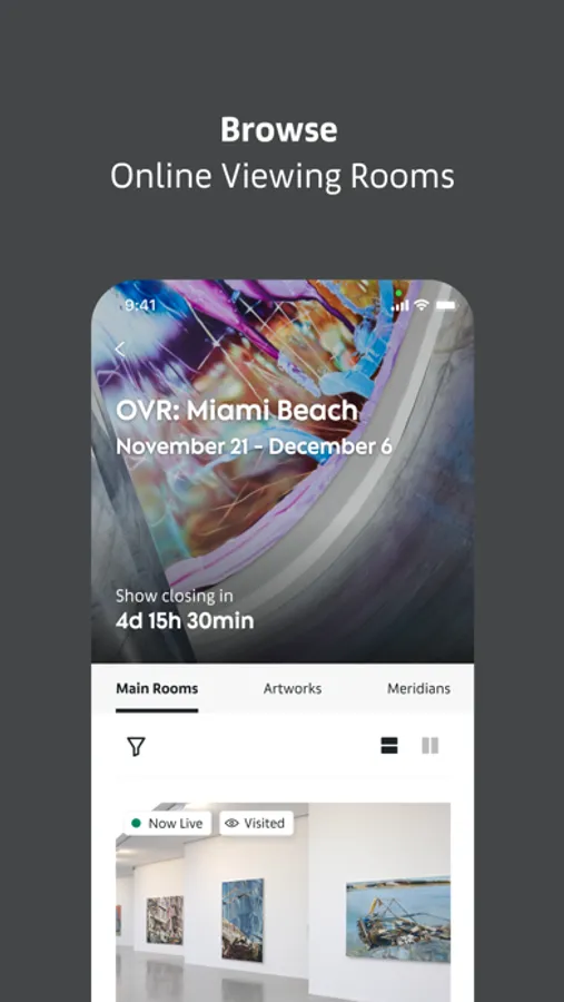 When live, the app also features our Online Viewing Rooms. You can browse artworks and start your own collection.