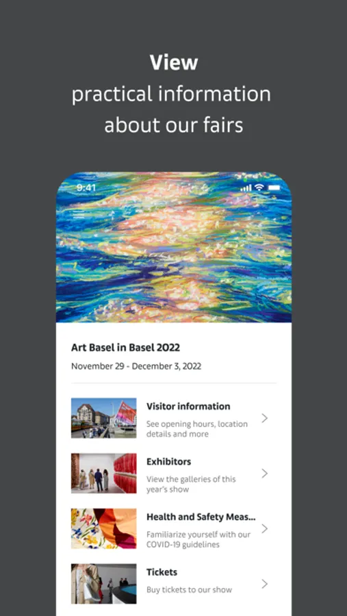 This is the official Art Basel app, featuring essential show information, news and updates from Art Basel, a catalog of artworks and galleries participating at the show, interactive floorplans, and events listings for every show.