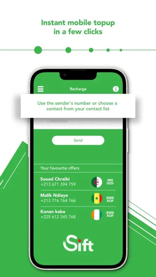 - Ease: sending a top-up takes only 3 steps and repeating a previous purchase takes only two clicks. Send a top-up directly via your telephone contacts. The top-up can be done on siftmobile.io or on the Sift mobile app.