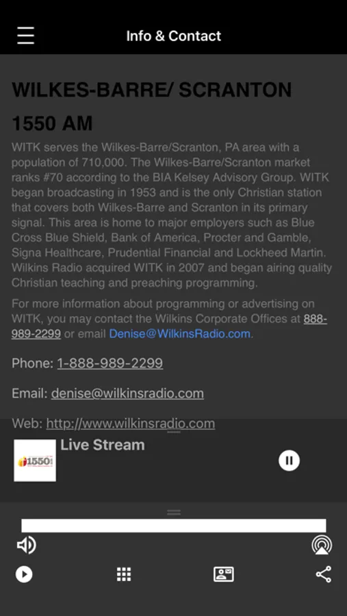 WITK serves the Wilkes-Barre/Scranton, PA area with a population of 710,000. The Wilkes-Barre/Scranton market ranks #70. WITK began broadcasting in 1953 and is the only Christian station that covers both Wilkes-Barre and Scranton in its primary signal. Wilkins Radio acquired WITK in 2007 and began airing quality Christian teaching and preaching programming.