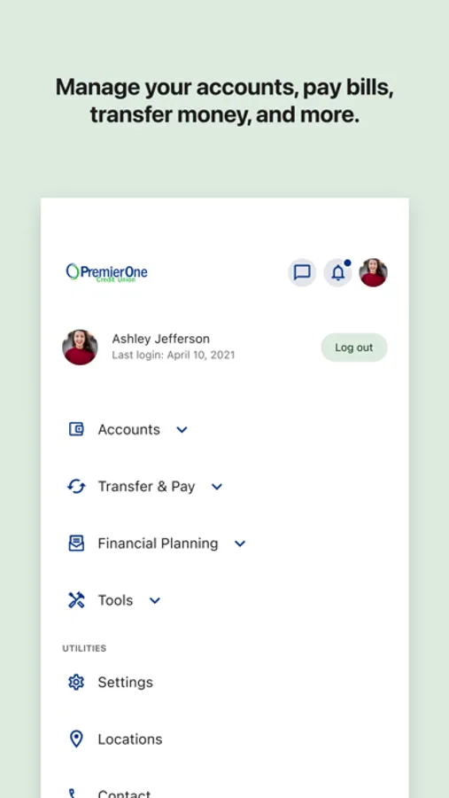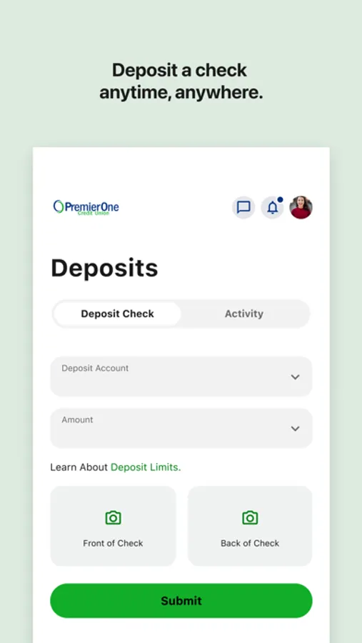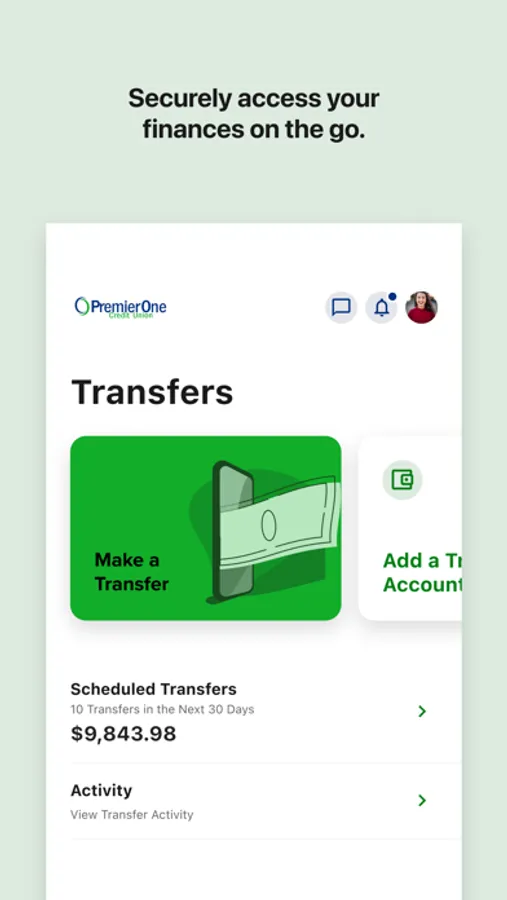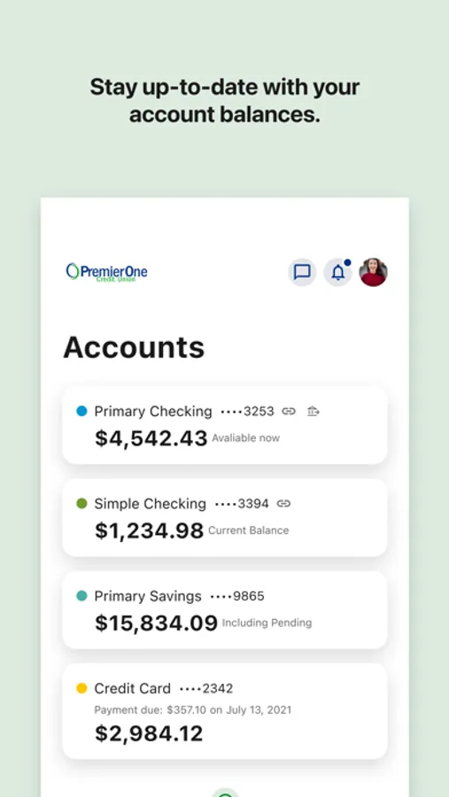 Enjoy the convenience of managing your accounts on-the-go! Access your PremierOne CU accounts easily wherever you are, 24 hours a day. With the On Device Enrollment feature you can enroll directly from the app, providing access to eBranch Online Banking. Our Mobile App gives users the ability to deposit checks and view cleared check images, view pending and recent transactions, Instant Balance option, view loan details, view credit score, transfer funds and pay bills. Get Live Update alerts to keep you up to date on changes to the app and access to ATMs and Branch Locator.