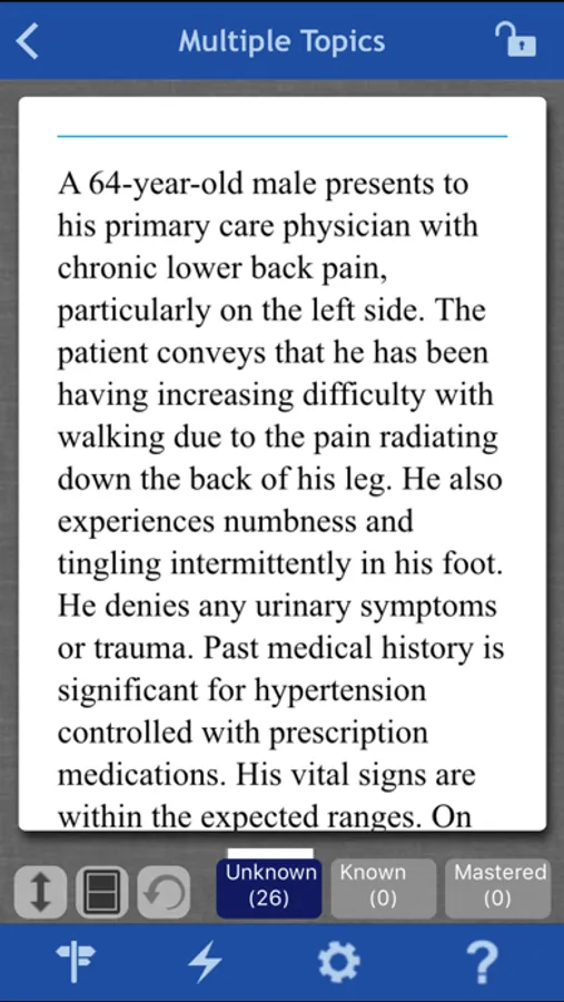 Organized into 9 major topics, this app provides a selection of clinical vignettes requiring the application of textbook knowledge to real-life scenarios.