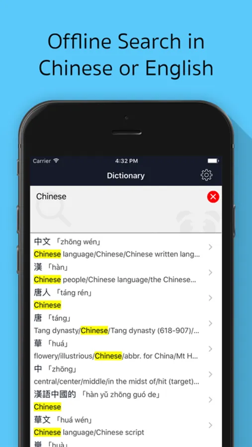 • Off-line Dictionary: over 188,888 commonly used Chinese characters, words, and idioms.