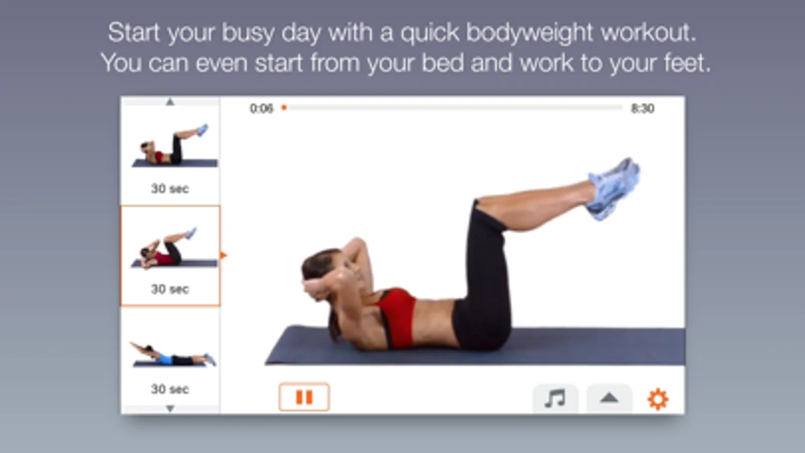 Quick Start - Start your morning right with a fast and effective bodyweight circuit workout. It starts lying down so you can begin the program from your bed and work your way to your feet. It will speed up your metabolism for the rest of the day and studies show that people that start with a workout are more likely to make healthier eating choices throughout the day.