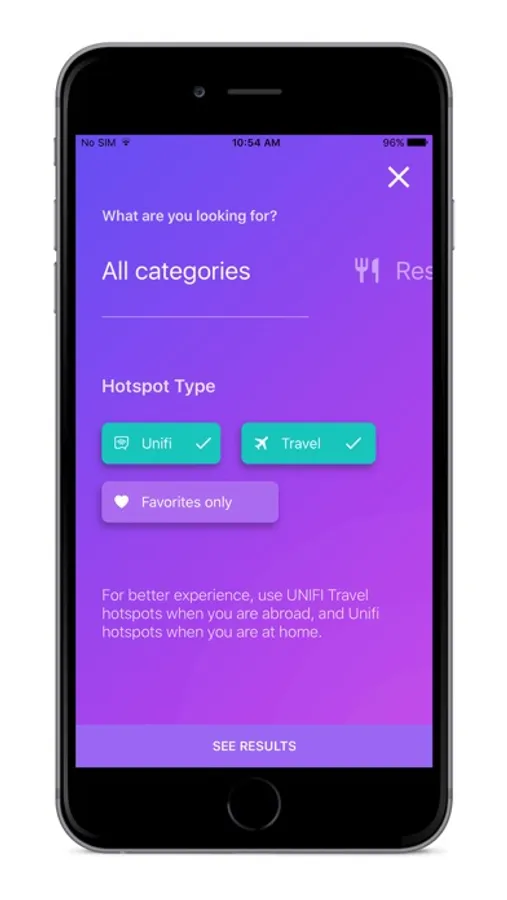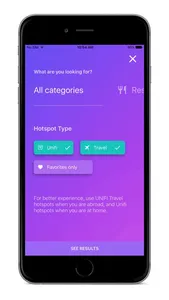 - Hotspot categories view (choose whether you’d like to use the application in hotels, airports, restaurants or all locations)