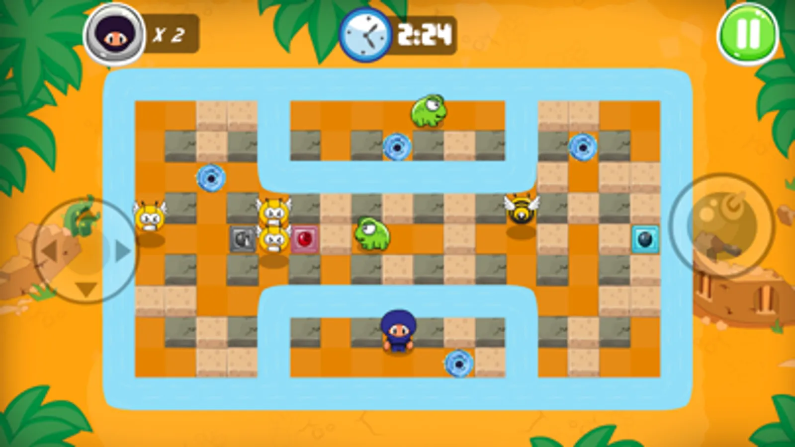 Ninja Boy Adventures is an strategy game inspired in the arcade’s classic Bomberman. Take power ups, put bombs and destroy all the enemies to complete the levels in this amazing adventure.