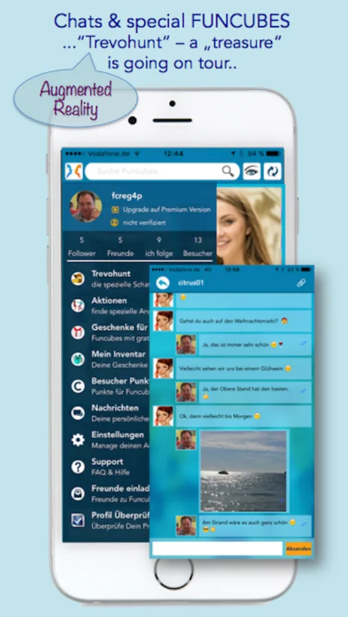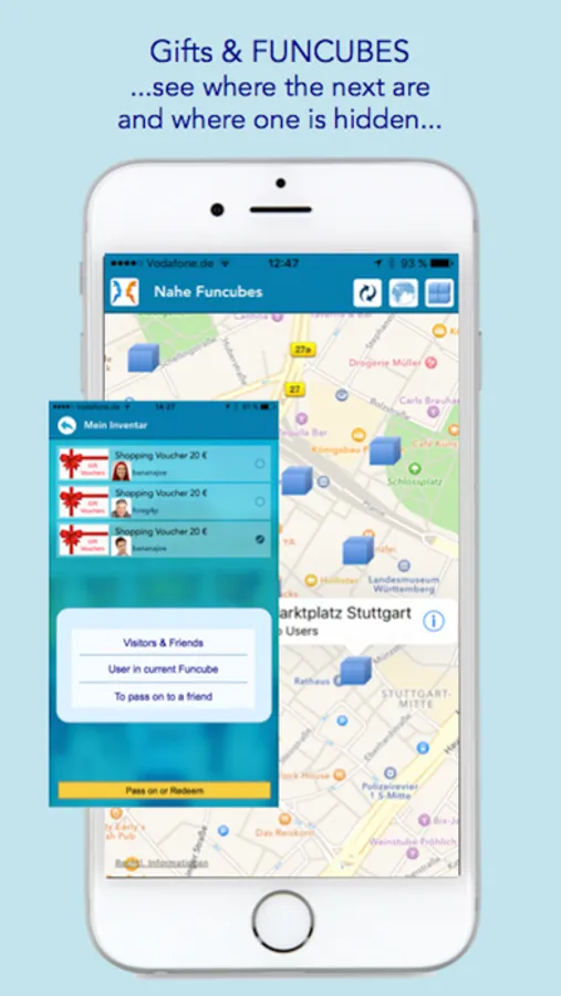 A FUNCUBE is a virtual cube with about 60 x 60 meters. Your FUNCUBES app navigates you to your desired FUNCUBES and keeps you posted with updates. You decide on-site, whether or not you like the other Funcubers, who are there for the same interests. Keep walking or enter the FUNCUBE, chat with pictures and videos, like and follow, rate reactions, or pass on a “caught” gift.