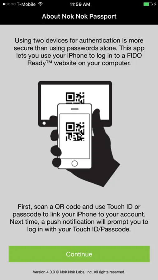 Nok NokTM Passport is an authentication app that allows you to authenticate to websites that will use Nok Nok Authentication Server. Passport makes it easier and more secure to log into these sites on your laptop or computer by employing Touch ID on your iOS device. Enabled websites will display a link allowing you to register using Passport app on your device. You can register by using Passport to scan a QR code displayed by the website, then touch the fingerprint sensor or enter your device passcode. Once enrolled, you can authenticate using a similar method. Alternatively, the website can send a push notification to iOS device; tap the notification to trigger authentication.