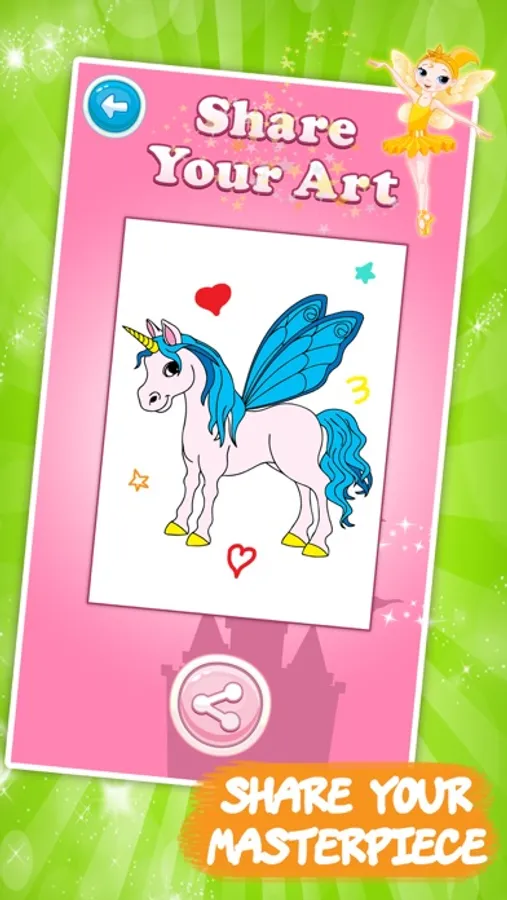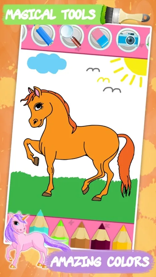Coloring pages book for kids is a game full of unicorns and horses and is not designed only for your 3-5 years old girls but your son as well. Color the coloring pages of unicorns and horses on your phone or tablet in this virtual coloring and painting book. It is so easy that even toddler can play. This coloring game is a kids game where children can color and draw unicorns coloring pages, but they can also draw horses and their own drawing and painting. Both, boys and girls will love this coloring book game for kids. In this coloring game you can find some of fairy tail creatures such as prince, princess, unicorns and horses.