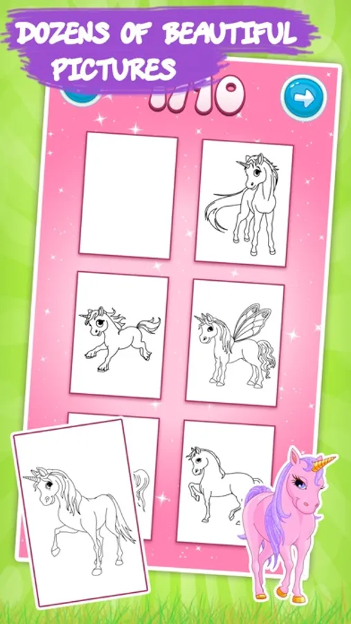 Your children can paint, draw, doodle and color unicorns and horses whenever they want to. Doodling, coloring, painting and drawing horses was never so easy and funny. Let your kids be creative by downloading this free game for kids with many pictures of unicorns and fairy tail horses which can be drawn, painted, colored or doodle.