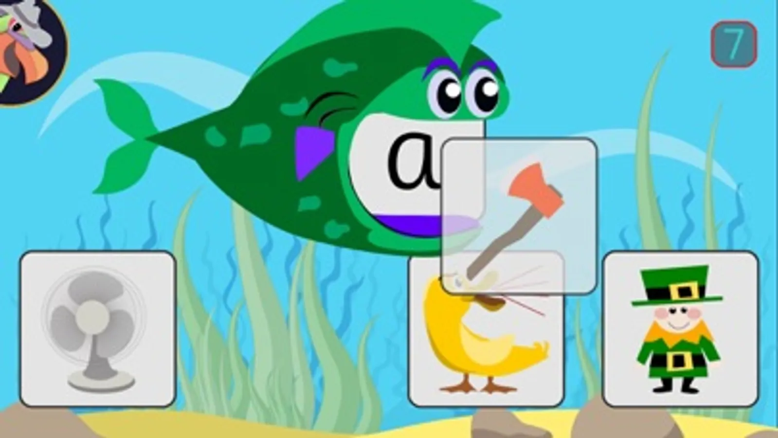 2 - Feed Green Gordie: Drag the image that starts with the sound into the fish's mouth