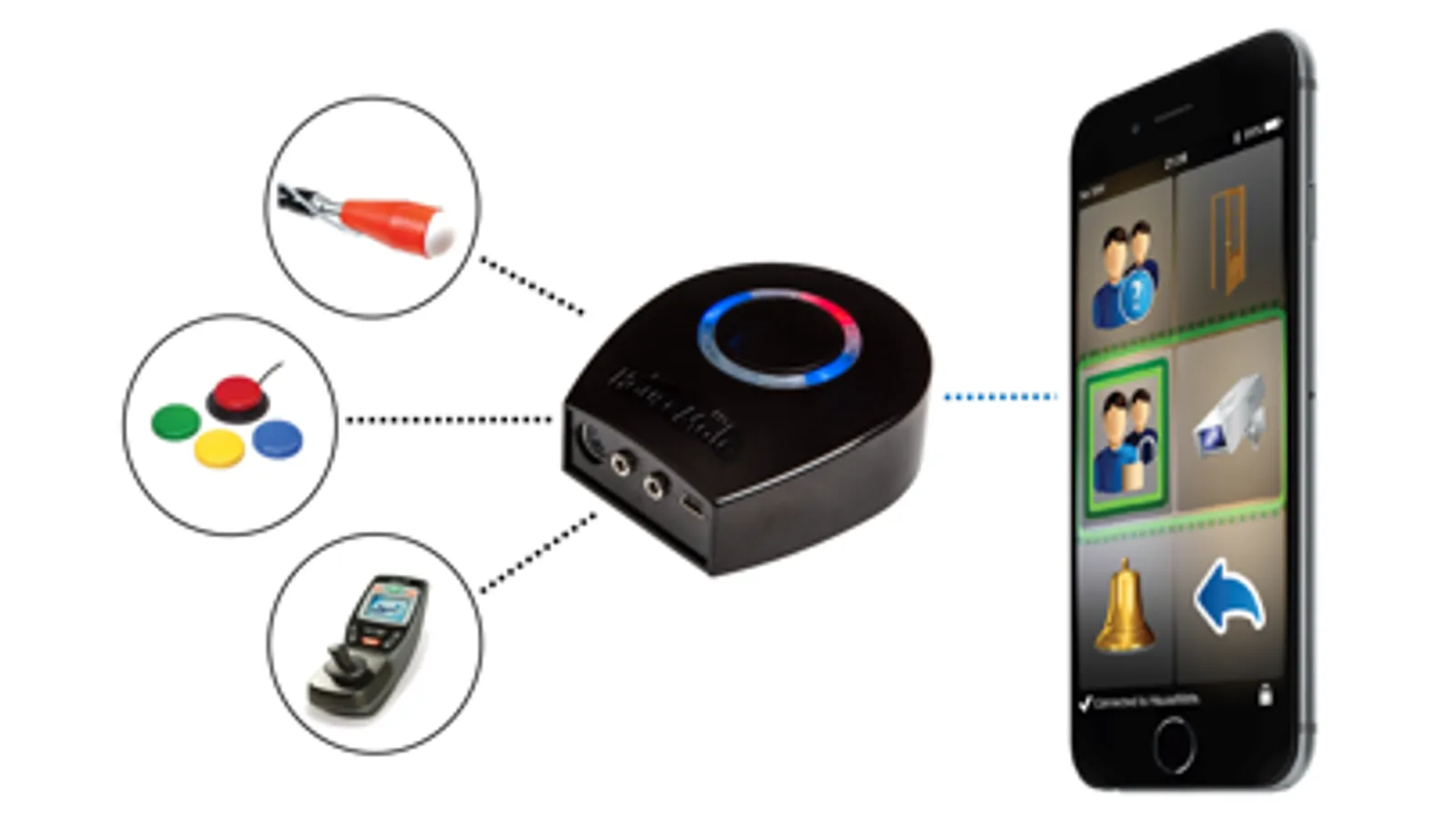 The hardware is controlled using the built-in switch or by connecting an external switch or joystick. It can also be interfaced to R-Net and DX wheelchair control systems.