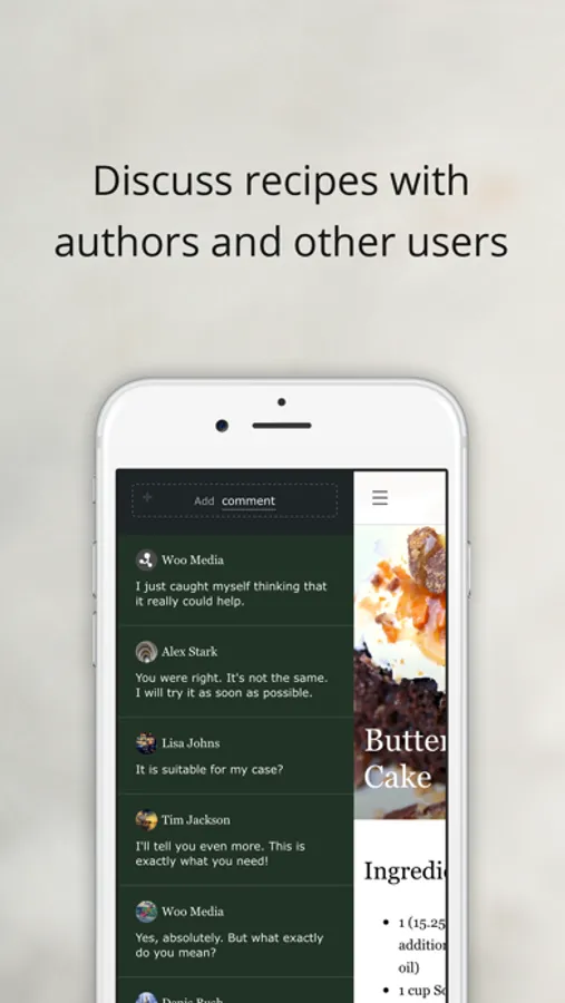 Comment and discuss recipes with other users and authors of articles. Share your favorite recipes with friends.