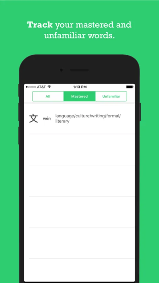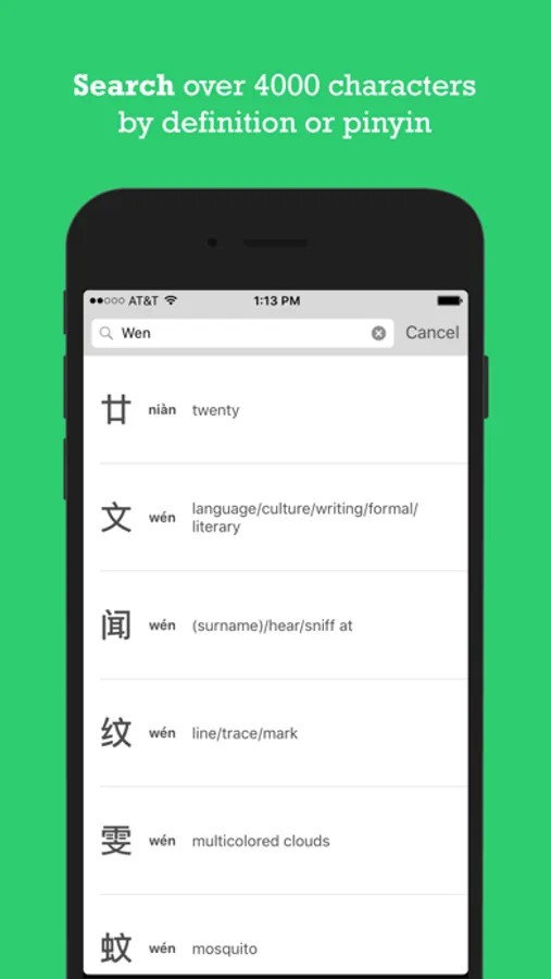 Master your Chinese characters with this simple and easy to use flashcard app, featuring over 4000 characters and an intuitive gesture-driven interface. Characters are shown based on familiarity and how common they appear in Chinese so you'll always be presented with something relevant. At any time, view a list of your mastered and unfamiliar characters and easily search for a character by definition or pinyin.