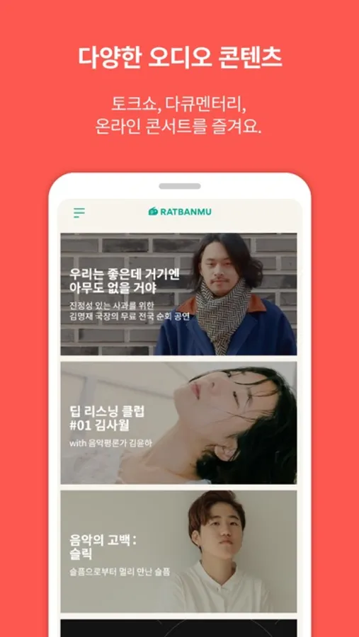 귀가 심심할 때, 웃음이 필요할 때에는 국내 최초 온라인 오디오 페스티벌, 오디오 다큐멘터리 등 랏도의 밴드뮤직에서 제작한 꿀잼 보장 오리지널 컨텐츠들을 들어보세요. 무료한 시간을 웃음으로 채워드릴게요.