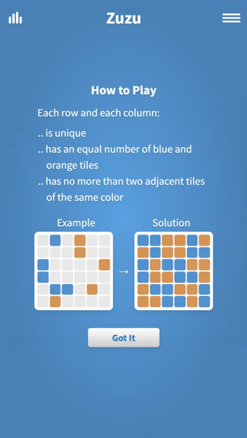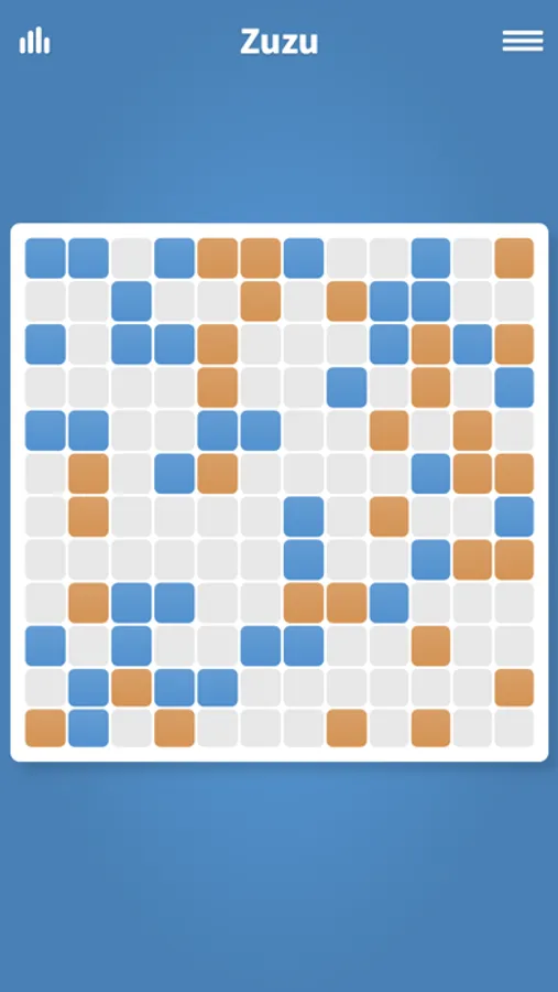 Your goal is to fill in the board using only logical determination, similar to Sudoku. Tap a tile on the board to set or change its color. Like the binary number system in general, there are only two tile colors, orange (0) and blue (1). Zuzu games begin with an unfinished grid that must be filled in correctly according to three rules listed below.