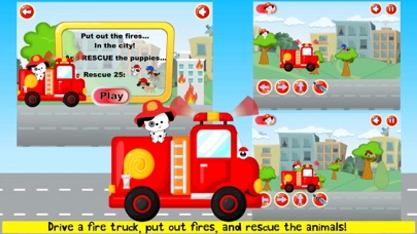 Hop in the fire truck and get ready for some fun driving! In the Firetruck Rescue Game you’ll be driving into different creative fun worlds like a cave, a forest, and a snowy wonderland. And what do firefighters do best? Put out fires and rescue animals and people! So as you drive in the different worlds you’ll be putting out things that are on fire and also jumping up to rescue different animals and pets. When you collect the right amount of animals you’ll be rewarded at the end with a fun animation and sound page including the sounds of what you just helped rescue. It’s fire truck fun to the max and perfect for everyone who wants to be a hero!