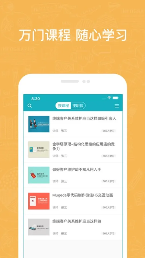 课程体系涵盖人力资源、财务管理、生产管理、电子商务、总裁课堂、职业素质、市场营销、客户服务、采购物流、综合管理十大类,并根据各个岗位规划专业的系统班课程,解决企业培训员工的难题。
