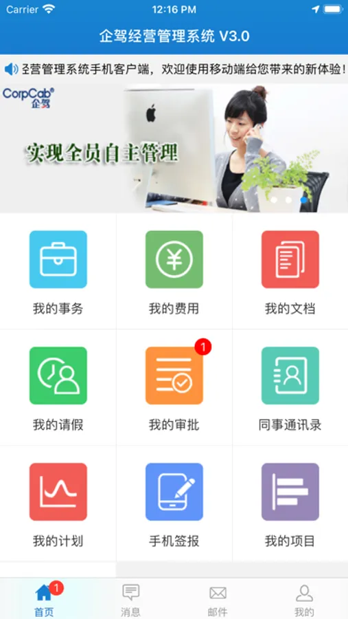 企驾手机客户端是用来连接企驾管理系统,对一些及时性要求较高的个人事务进行处理。