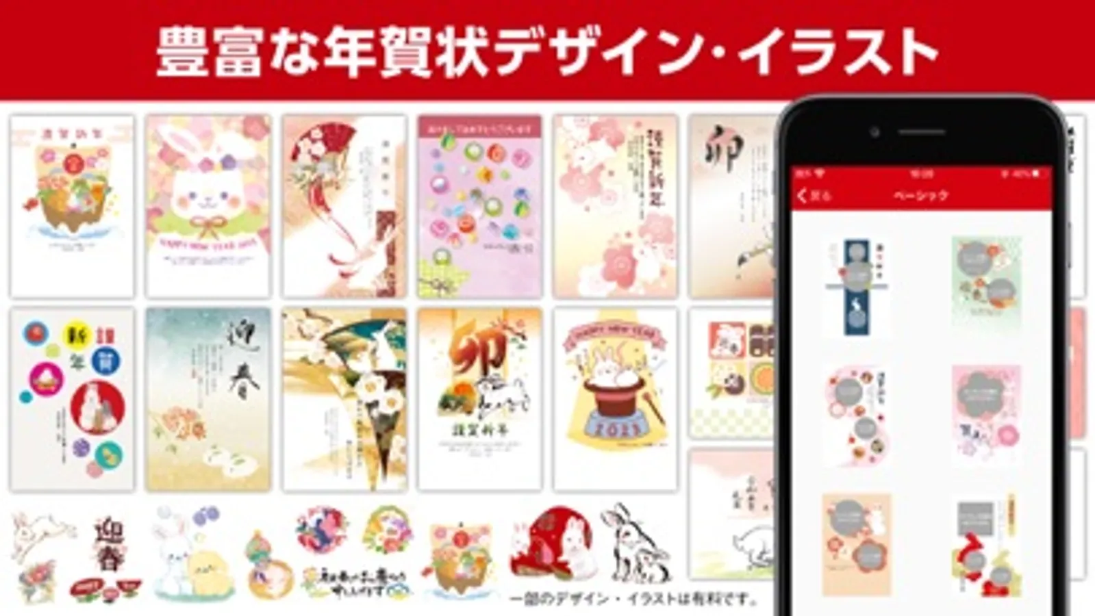 年賀状デザインは、写真年賀状・干支や縁起物のイラスト・カジュアルなものなど、豊富に用意。
